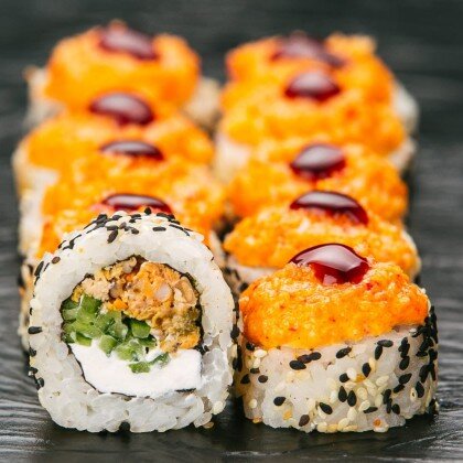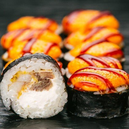 Состав: рис, нори, сыр чеддер, перечный соус, огурец, лук фри, куриная грудка копчёная и соус с беконом. Выход: 320 гр.