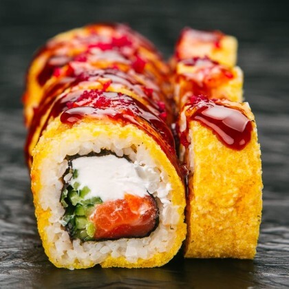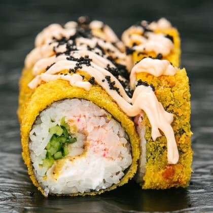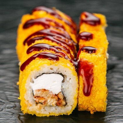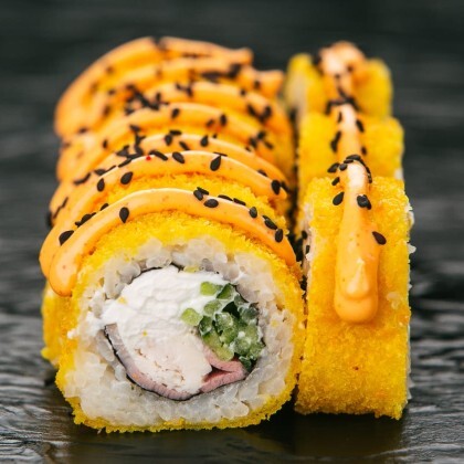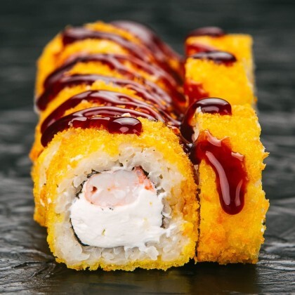 Состав: рис, нори, сливочный сыр, куриная грудка копчёная, огурец, чесночный соус, соус унаги и икра масаго чёрная. Выход: 350 гр.