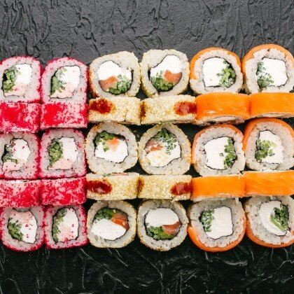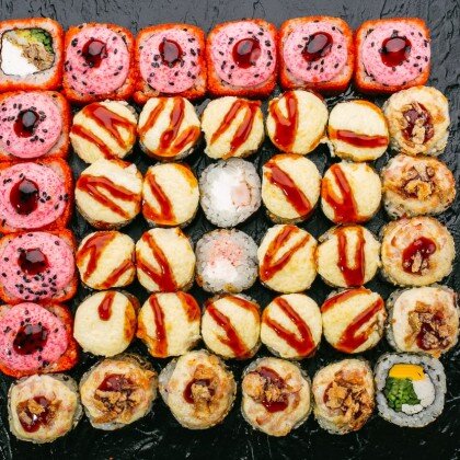 Состав: ролл с японским омлетом и сливочным сыром, ролл запеченный с крабом, ролл запеченный с мидиями и крабом, ролл жаренный с курицей, ролл жаренный с крабом и томаго, ролл бекон и тилапия спайси. Выход: 2,120 кг.