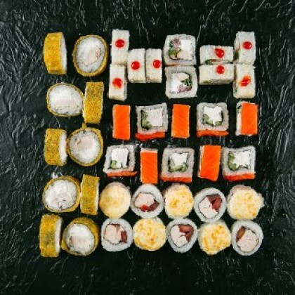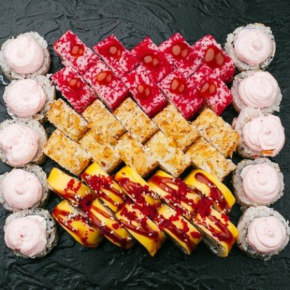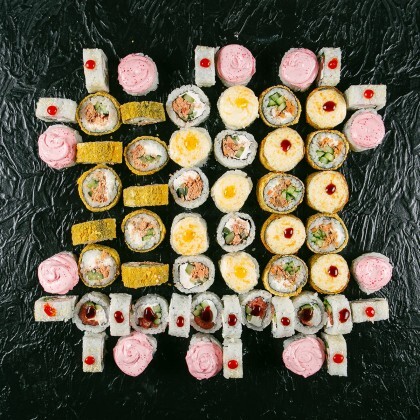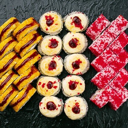 Состав: ролл филадельфия, ролл с лососем сливочным сыром и соусом унаги, ролл калифорния.