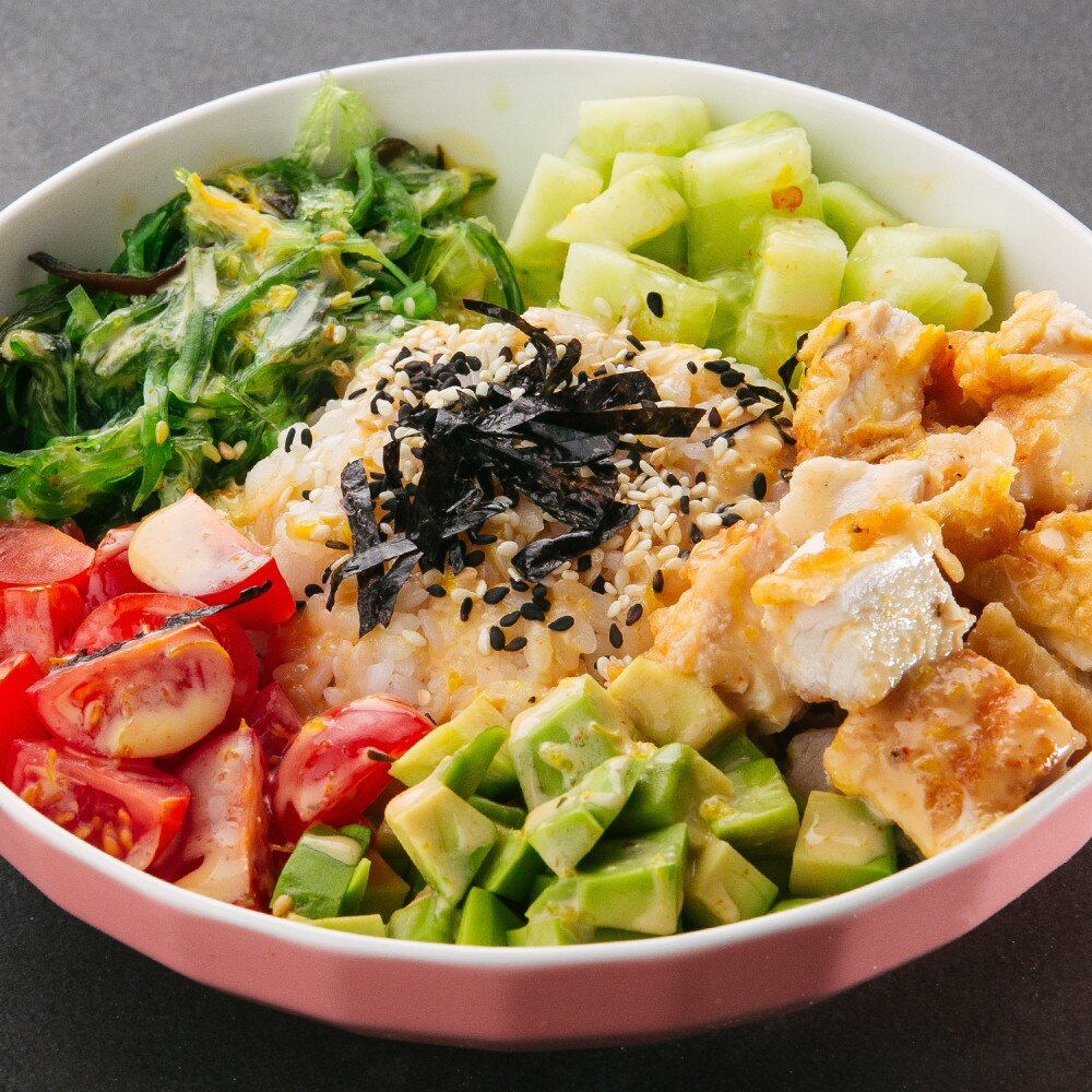 Состав: рис, авокадо, водоросли нори, курица, пекинская капуста, семена кунжута белые, семена кунжута черные, соус для поке, фунчоза во фритюре, помидоры черри. Выход: 0,400 кг.