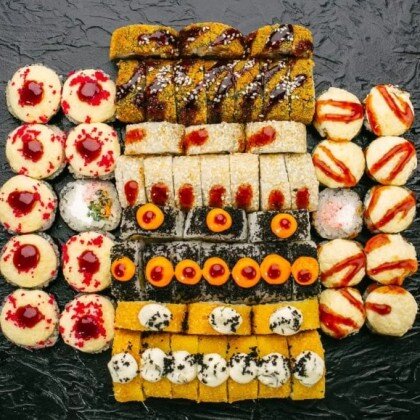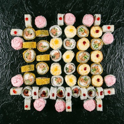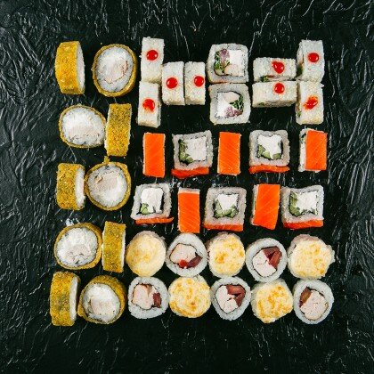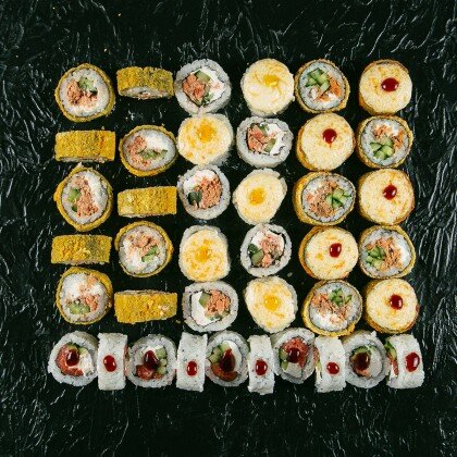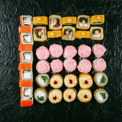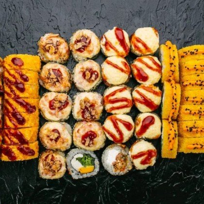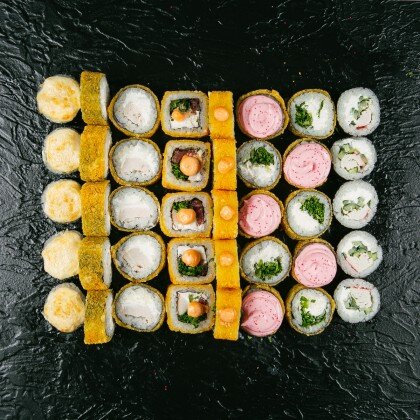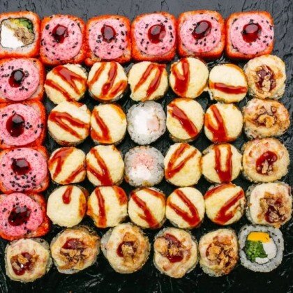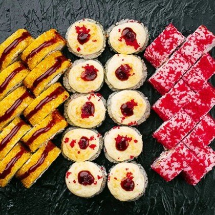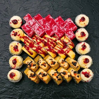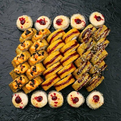 Ролл "филадельфия лайт", ролл "сливочный "Лава", ролл "жареный с курицей и соусом спайси", ролл "жареный с сыром", ролл "запечённый сяке", ролл "запечённый с крабом" (60 шт.)