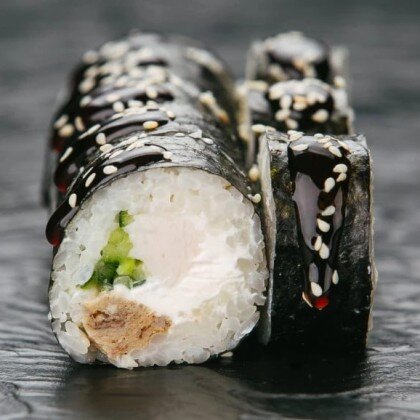 Рис, нори, сливочный сыр, свежий лосось, огурец и стружка тунца (10 шт.)