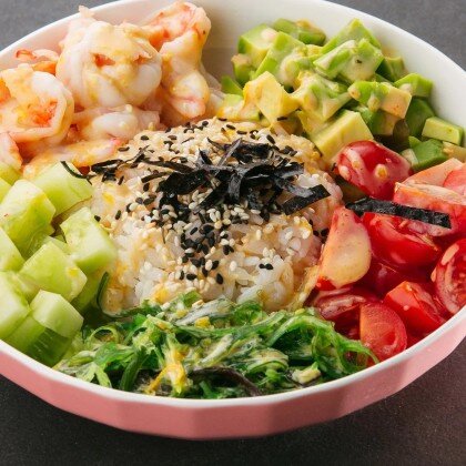 Авокадо, водоросли нори, лосось, пекинская капуст, рис для суши, семена кунжута белые, семена кунжута черные, соус для поке, фунчоза во фритюре, помидоры черри