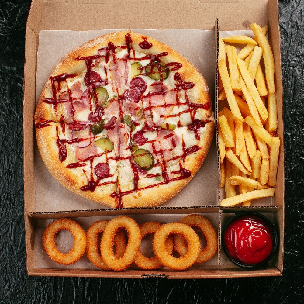 Пицца "Барбекю" 20см, картофель фри, луковые кольца, кетчуп