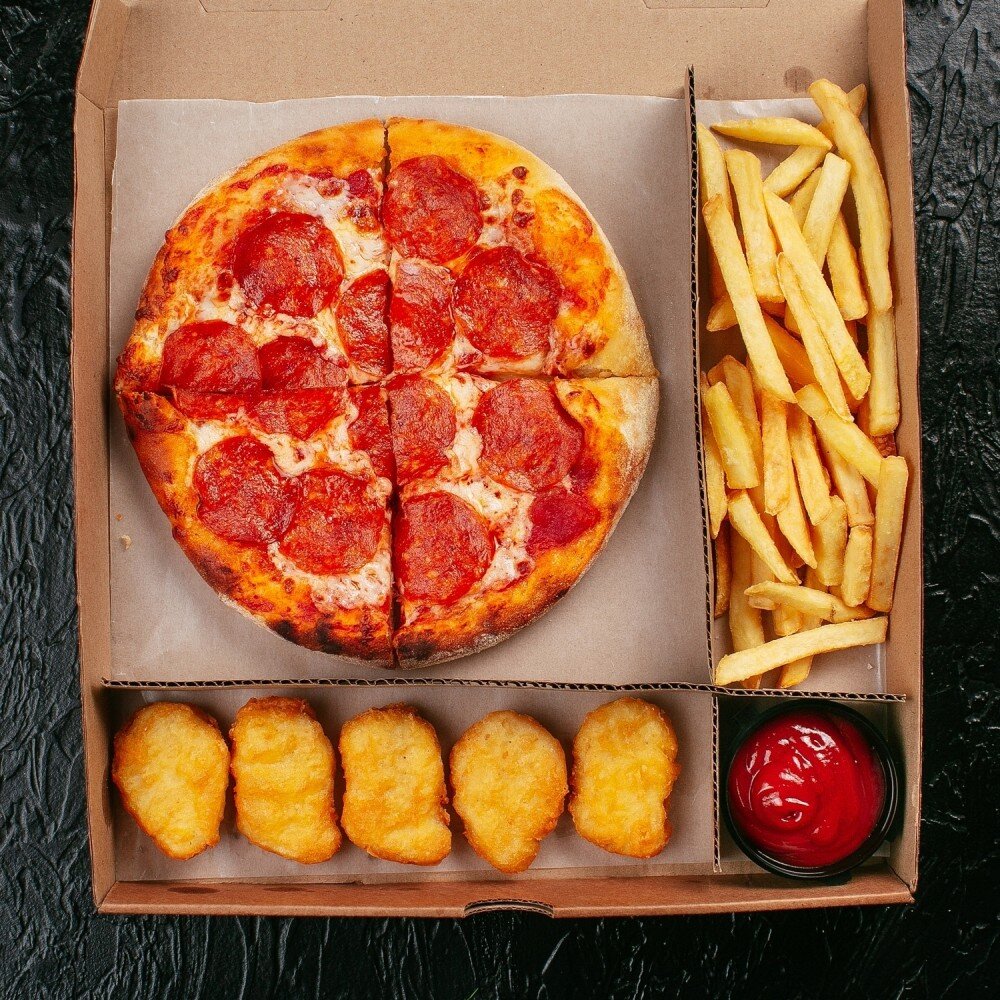 Пицца "Пепперони" 20см, картофель фри, наггетсы, кетчуп