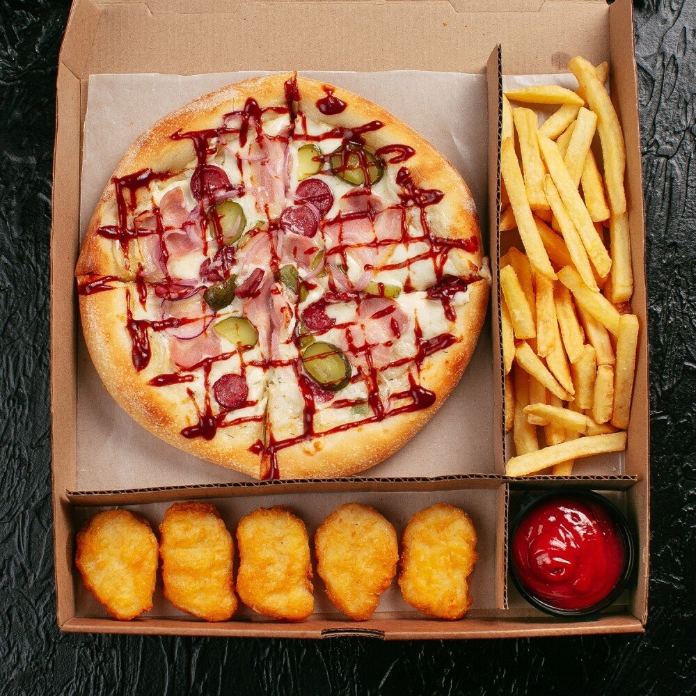 Пицца "Барбекю" 20см, картофель фри, наггетсы, кетчуп