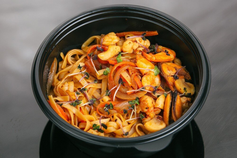 Лапша удон, тигровые креветки, мидии, кальмар, соевый соус, соус терияки, кабачок, микрозелень