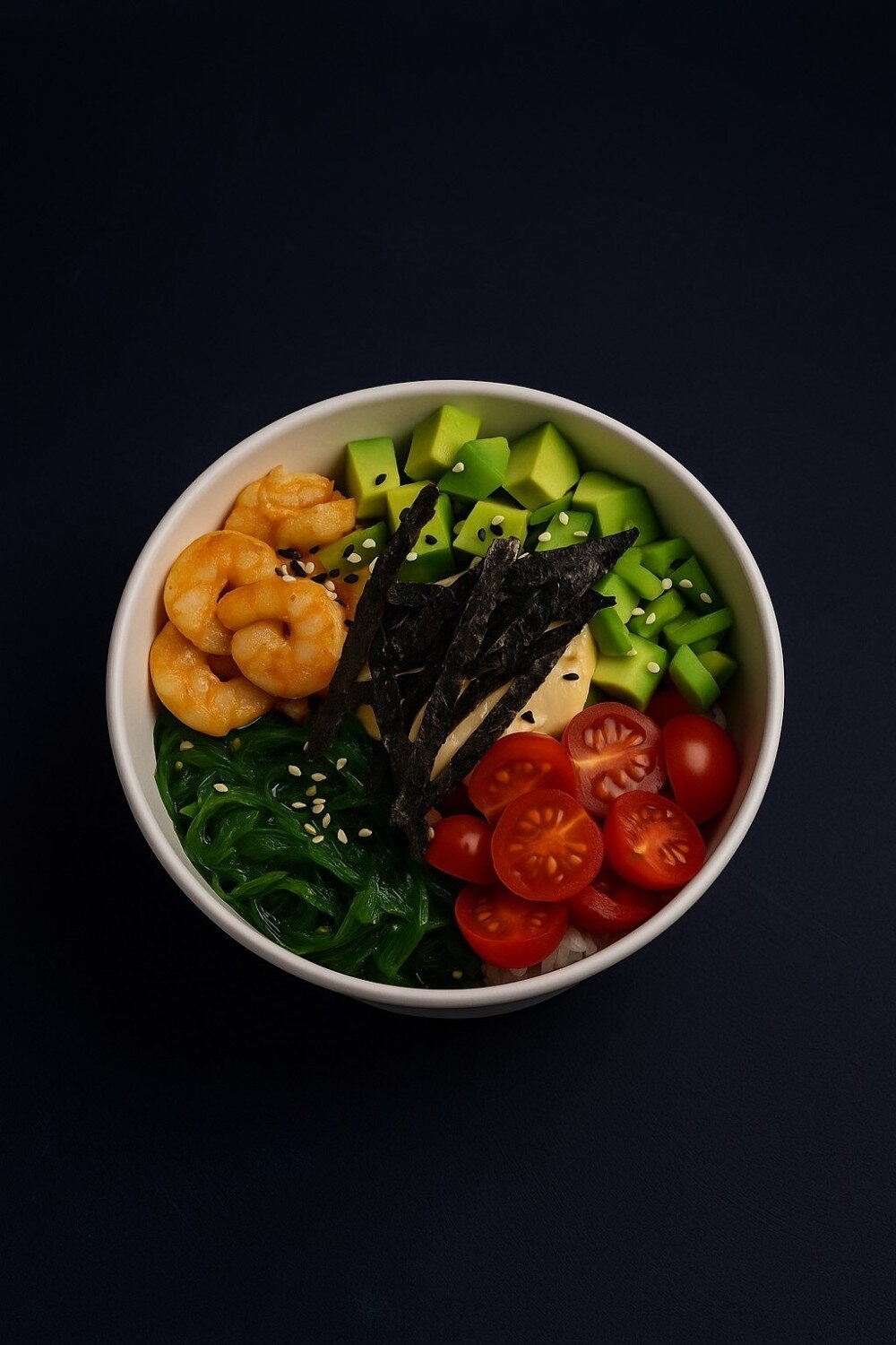 Водоросли чука, ореховый соус, авокадо, рис, помидор черри, огурец свежий, фирменный соус, водоросли нори, тигровые креветки, семена кунжута