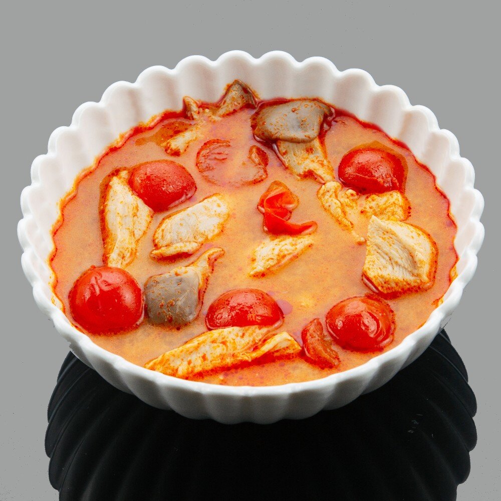 Бульон куриный, филе курицы, грибы вешенка, помидор черри, кокосовое молоко